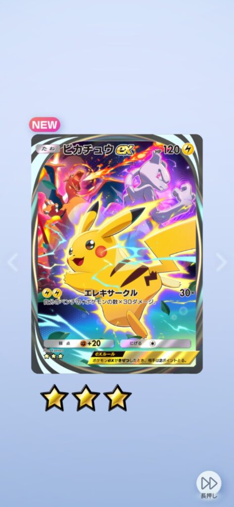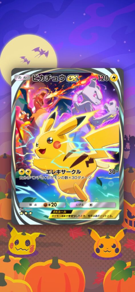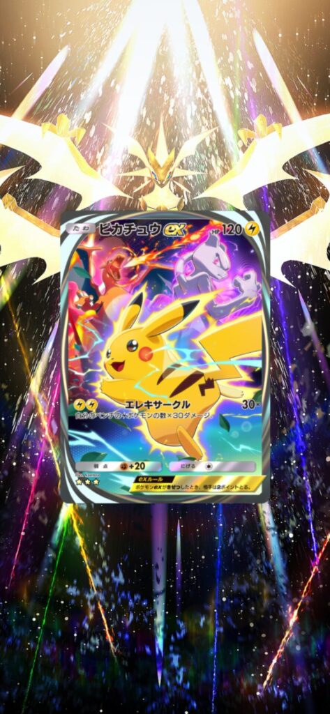 ポケポケ(Pokémon Trading Card Game Pocket)で「ピカチュウex」の星3(イマーシブ)を自引き出来たので軽く記事に。