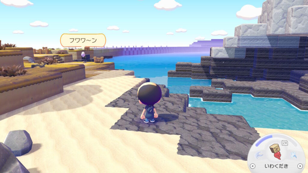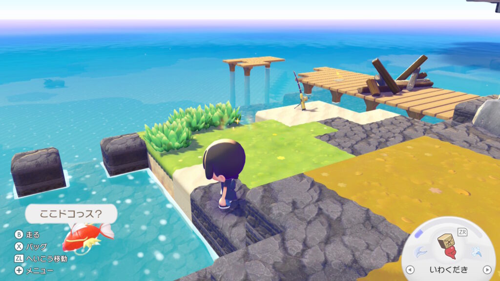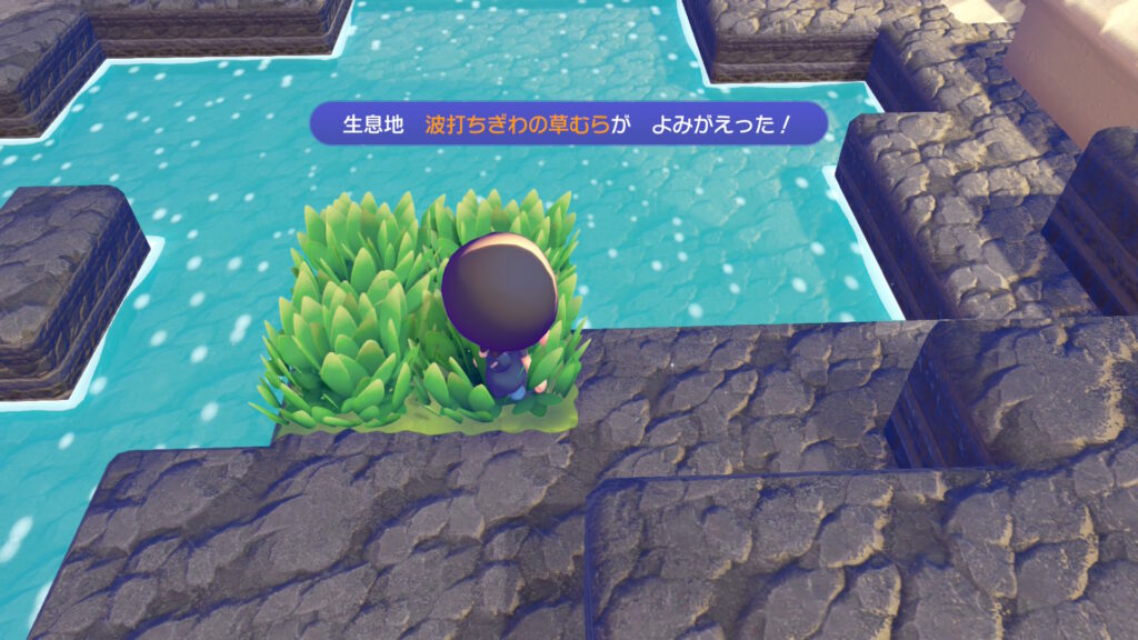 地面も自分でつくれってことか?と思って「そうげんのしばふブロック」を海に配置して草を置いて成功。