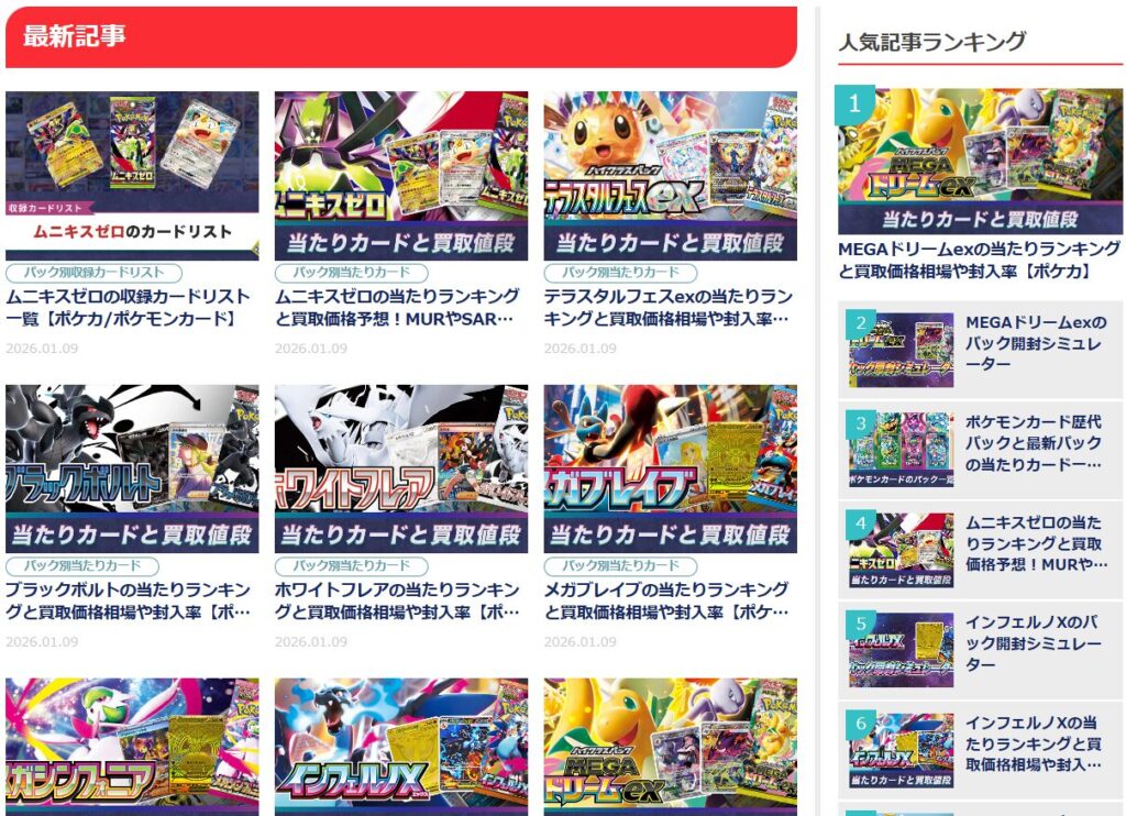 もちろん販売価格や当たりランキング、カード一覧やその他の記事もあり、写真付きで載っているので見やすく色んな場面で使えそうです。