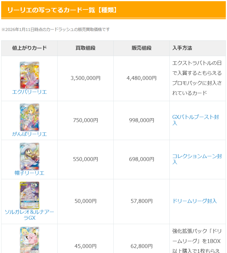 金額あれこれに限らず、公式が公開した新パックのカード情報も随時更新しながら載っており、